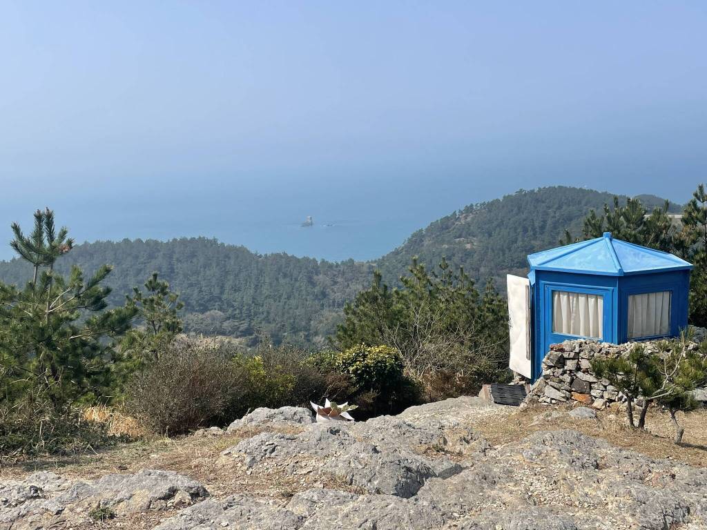 On the map that a lady at the Olle Trail information centre at Sangchuja Port gave me, I can see that the path is headed for Dondaesan Mountain. I consider skipping this climb and instead follow the seaside road for more ocean views. However, once I reach the entrance of the forest trail, a lovely older Korean couple kindly redirect me. So up the hill and through a bamboo grove I go. The climb is pretty steep, but once again I’m rewarded with amazing views. As I reach the beginning of the ridge, just below the top, I find a a small hexagonal blue hut. The west-facing door is open and a man is sitting in the shade nearby. If this was in the Himalaya, this would definitely be a place to buy a chai or some snacks. But the man in the shade seems to be taking notes of something. So I’m guessing this is more of a guard post or watchtower. I take a picture of the pretty scene and move on the real peak. In proper Olle Trail fashion there is a wooden Ganse stamp station set up for hikers, marking the half-way point for path 18-1. I’m starting to get a little hungry and soon make my way back down to sealevel.