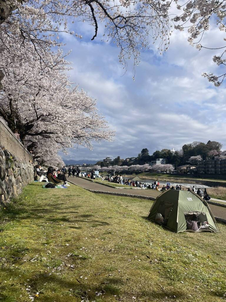 I usually find a quiet place at Saigawa river, between the Saigawa-Ōhashi Bridge and Saigawa Ryokuchi Park, or along Asanogawa and in Tamagawa Park, where people gather in small, easygoing circles. With my friends I spread out a blanket beneath branches heavy with blossoms, unpack simple snacks and a few drinks from the supermarket, and settle in petals slowly drift down. There is no rush, just the low hum of conversation, the occasional clink of cups, and that shared, fleeting awareness that this exact moment, like the sakura above us, will not last for long.